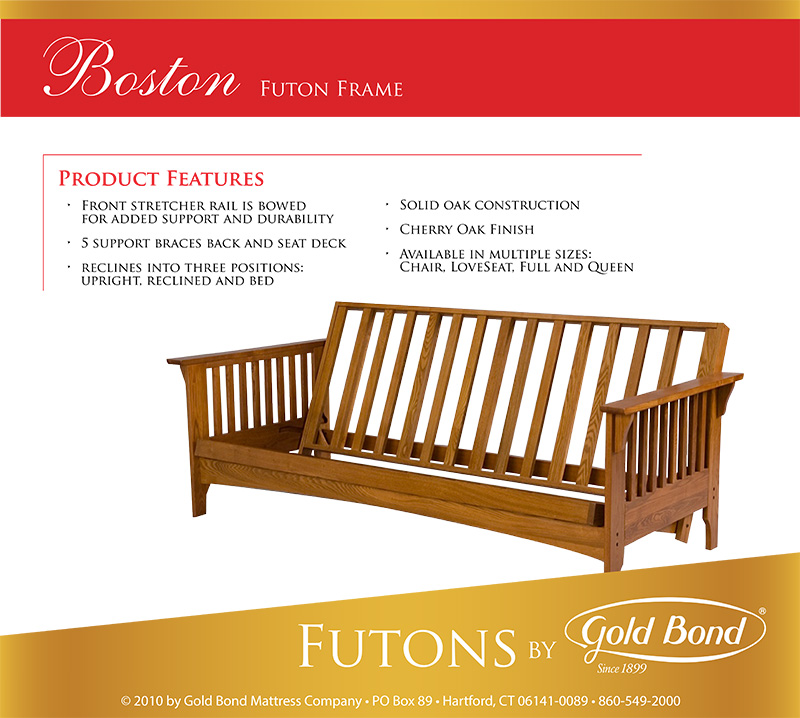 Regardless of your decor, Gold Bond has a futon frame that will meet your design needs. Available in Siberian solid oak, this Gold Bond futon frame is designed for beauty, strength and durability to last a lifetime in any room of your home. And the Gold Bond Boston Futon Frame is the perfect futon classic. Exceptional value combined with easy, crisp styling. With a rich looking cherry oak finish, it looks good, sits good, feels good! Mattress not included.