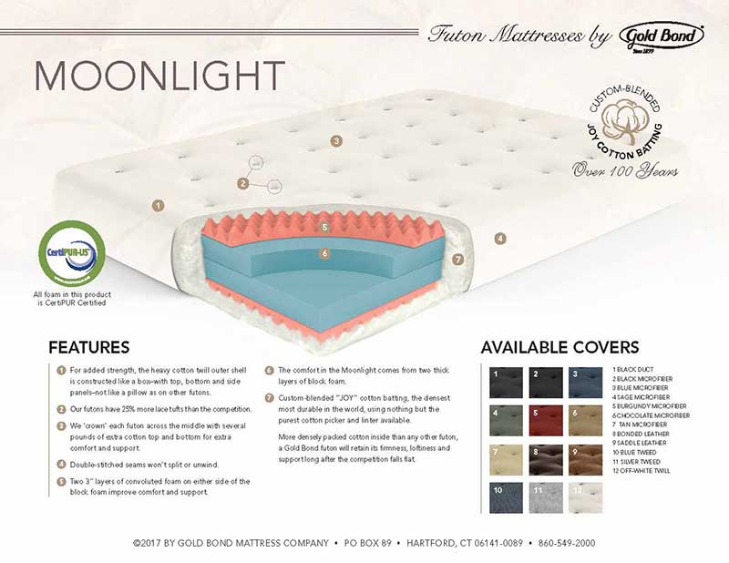 The Gold Bond Moonlight Futon is today's best futon value. Two layers of super-soft foam and two thick layers of block foam, all wrapped in our exclusive JOY® natural cotton batting gives the Moonlight futon mattress excellent comfort and support. Futon frame is not included.