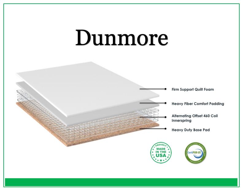 The Dunmore mattress provides firm support at an affordable price featuring environmentally conscious heavy fiber pads and a 460 verti-coil spring system for premium support. Made locally in Massachusetts.