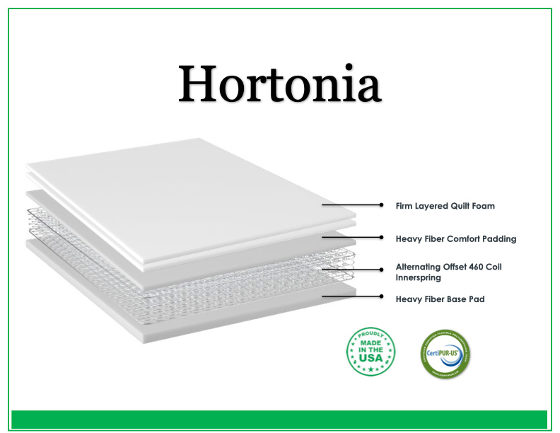 The Hortonia mattress provides firm support at an affordable price featuring firm support quilt foam, a breathable cover, environmentally conscious heavy fiber pads and a 460 verti-coil spring system for premium support. Made locally in Massachusetts.